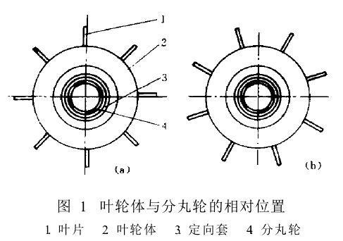 如圖1a所示,分丸輪窗口在兩個葉片中間,此時的拋丸機(jī)的清理效果好:而圖1b所示的分丸輪窗口正對著葉片,此時分丸輪分出的彈丸受到葉片的阻擋,拋出去的彈丸少,從而影響拋丸量。