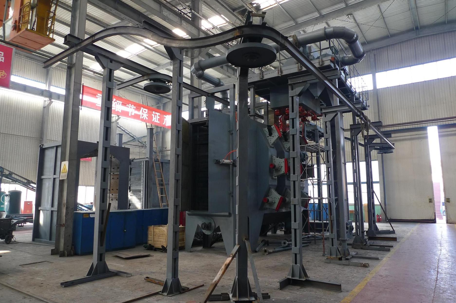 工件在吊具的吊裝下進(jìn)入拋丸清理室,當(dāng)進(jìn)入拋丸清理區(qū)后,懸鏈自動(dòng)停止,同時(shí)大門關(guān)閉,工件在自轉(zhuǎn)機(jī)構(gòu)的驅(qū)動(dòng)下自轉(zhuǎn),同時(shí)拋丸器對(duì)工件進(jìn)行拋丸清理,清理完畢,彈丸控制器停止供丸,大門打開,工件在懸鏈輸送系統(tǒng)的驅(qū)動(dòng)下被輸送出拋丸清理室,同時(shí)下一組鉤吊裝的工件被輸送進(jìn)拋丸清理室,重復(fù)以上過程,對(duì)工件進(jìn)行高效率的拋丸清理。