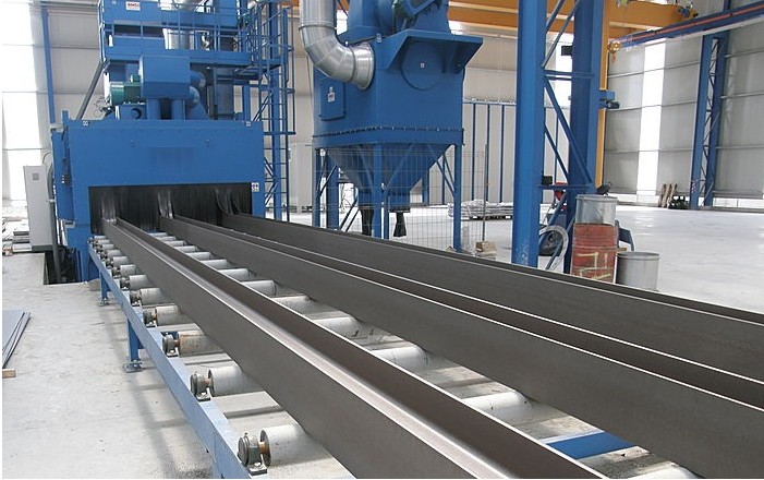輥道通過式拋丸清理機是將工件吊放在輸送輥道上,輥道輸送系統(tǒng)將工件向前輸送,當工件進入清理室時,拋丸器開始順序工作。經(jīng)過拋丸處理后,鋼材表面的氧化皮、污物及其它附著物被清理干凈,處理過的表面可達Sa2-2.5級。拋丸機的工作方式是連續(xù)循環(huán)進行的。